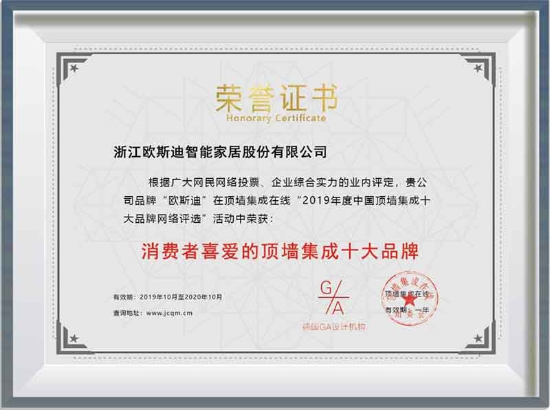 The “2019 Top Wall Integration Top Ten Brands” selection event hosted by Xinbang Technology·Integrated Ceiling Online was kicked off in early September, and the results of the selection on October 14 were officially announced. The "OSIDI" brand was awarded the top ten brands in the 2019 consumer favorite top wall integration!