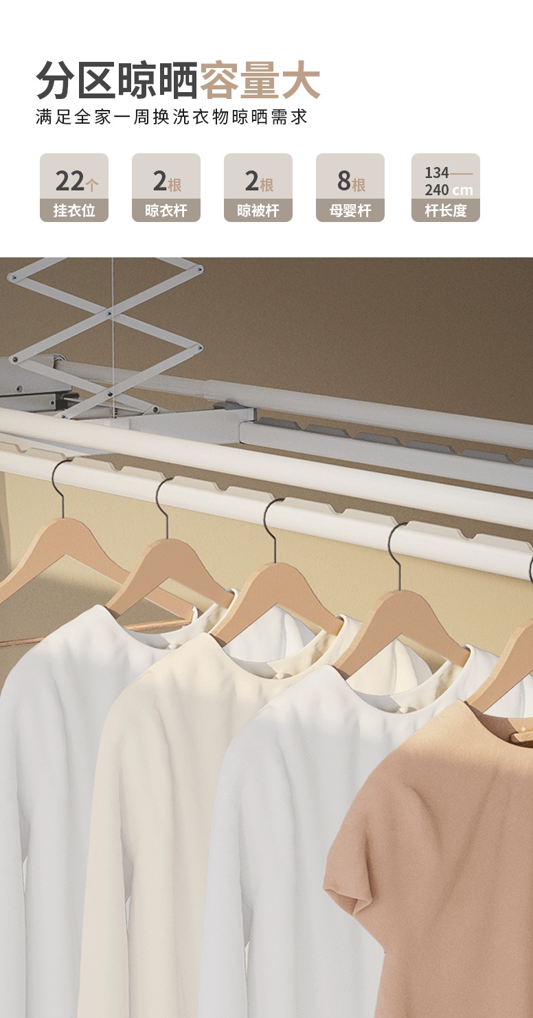 35KG超強承重,可以實現(xiàn)一次性晾完全家的衣物,同時配置晾被桿,衣服被子可以同時晾曬。