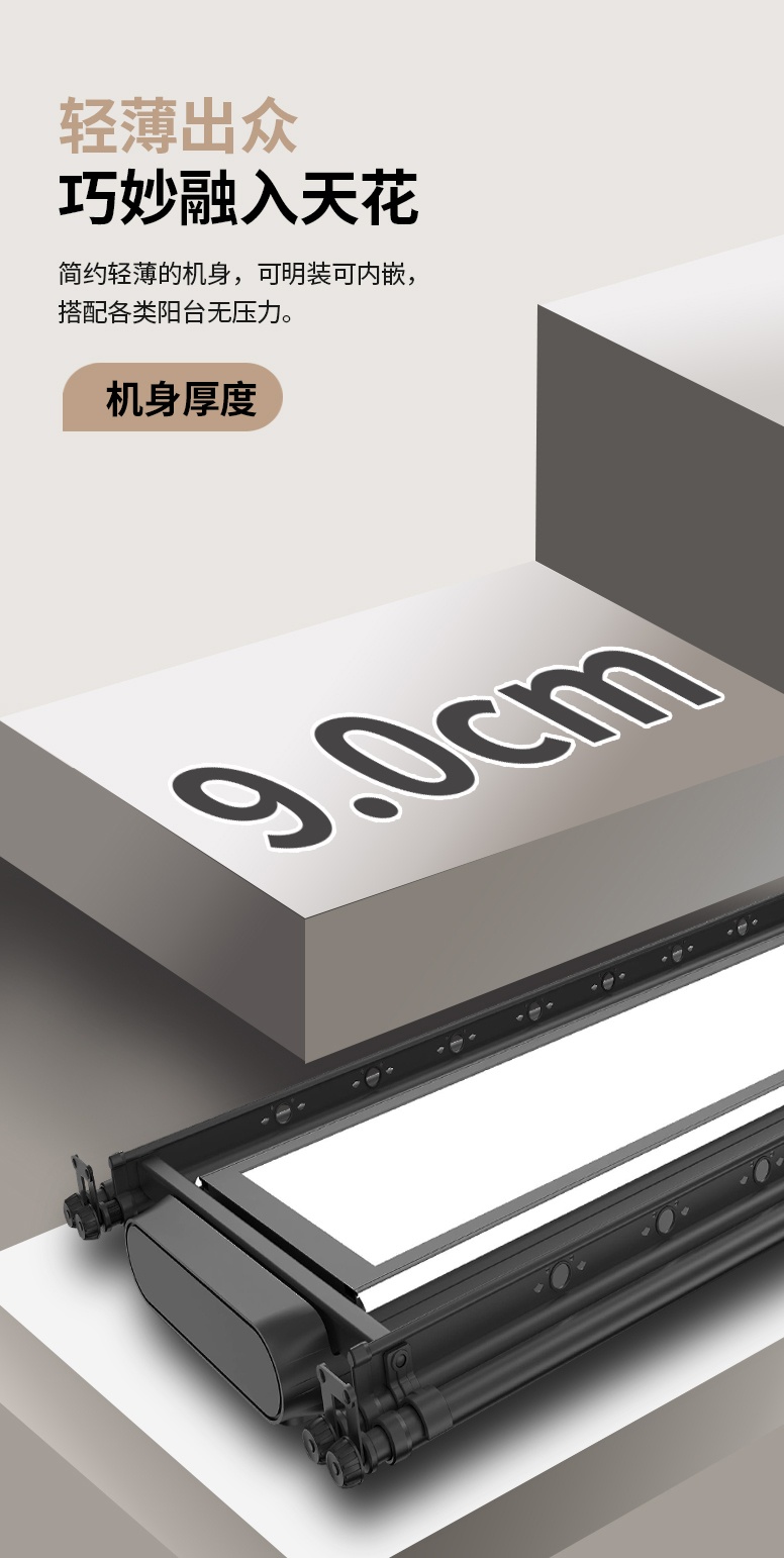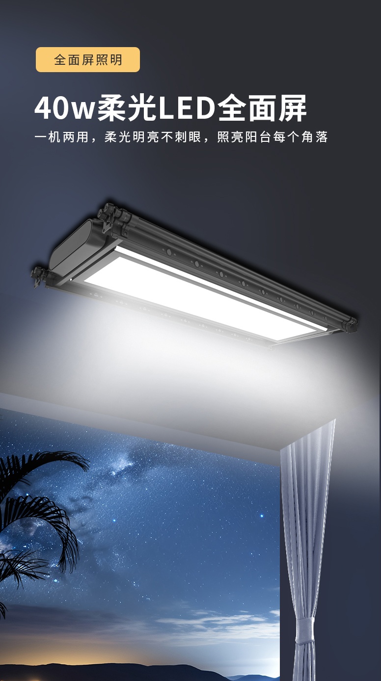 9cm超薄機身,晾桿收回就能變身為一臺全屏LED燈,一機兩用。打造智能舒適的現(xiàn)代化陽臺新生活。