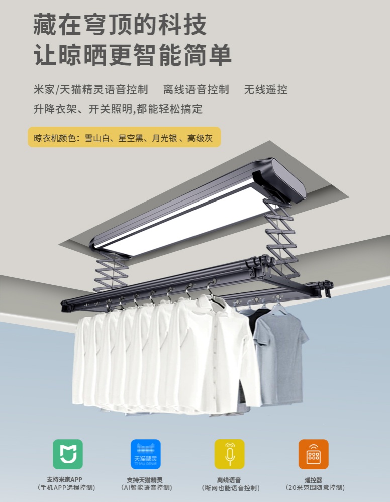多重巧妙又貼心的設(shè)計,讓晾曬更舒心。自定義晾曬高度,可外連米家/天貓精靈,使用更方便。上升或下降過程中遇到阻礙,晾衣機自動暫?!N心小設(shè)計,大大提高了晾曬體驗,讓人真正享受到智能生活的便利和愉悅。