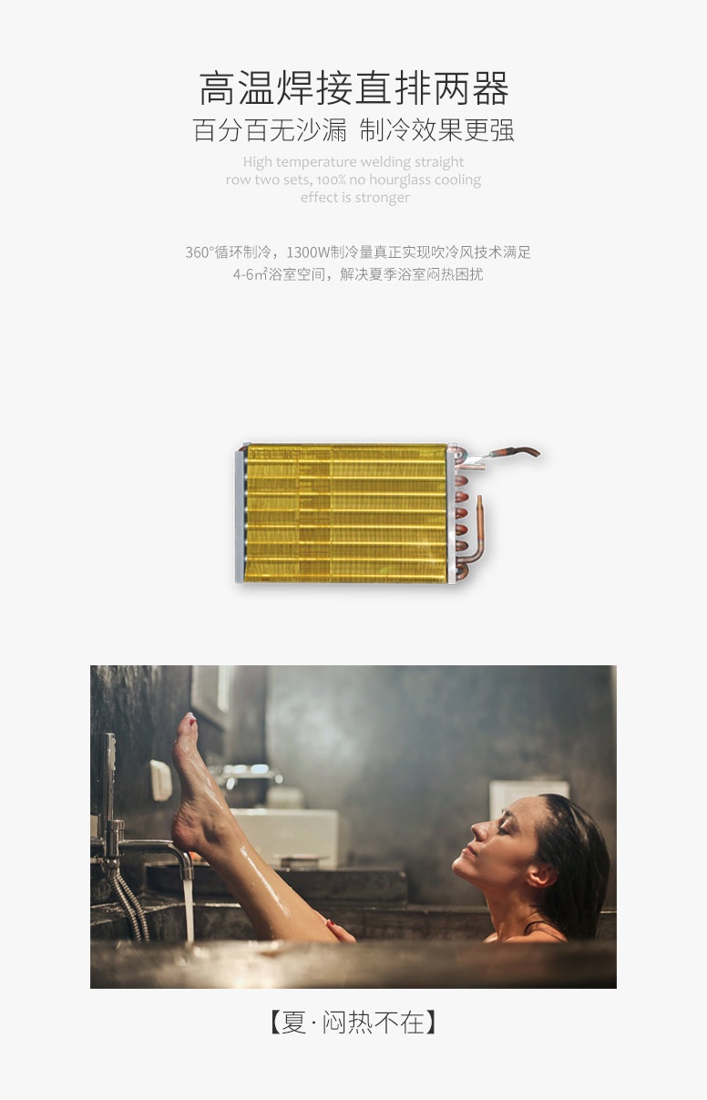 夏·悶熱不在:360°循環(huán)制冷,1300W制冷量真正實(shí)現(xiàn)吹冷風(fēng)技術(shù)滿足,解決夏季浴室悶熱困擾