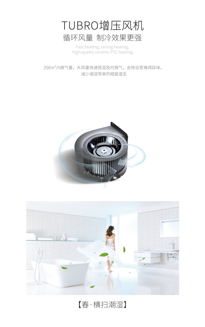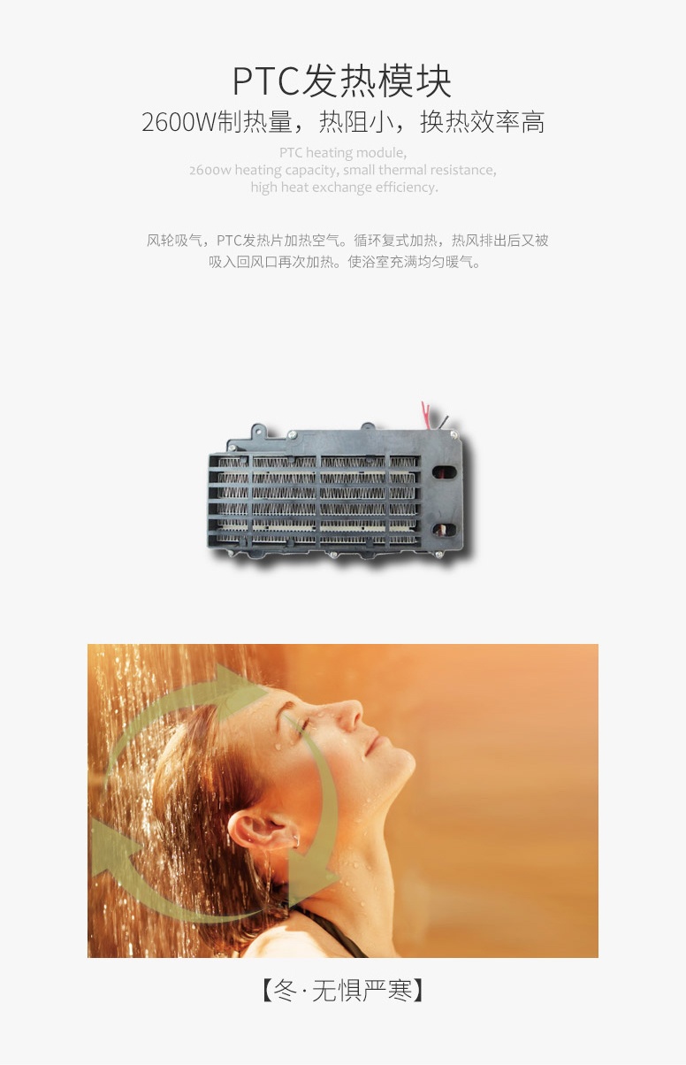 冬·無(wú)懼嚴(yán)寒:2600W制熱量,風(fēng)輪吸氣,PTC發(fā)熱片加熱空氣。循環(huán)復(fù)式加熱,熱風(fēng)排出后再吸入再次加熱,使浴室充滿均勻暖氣。