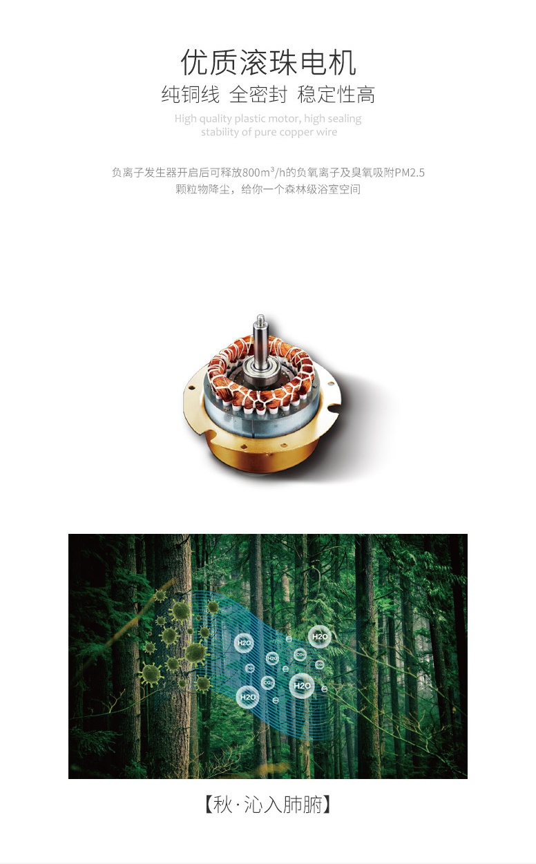秋·沁入肺腑:負(fù)離子發(fā)生器開啟后可釋放800m3/h的負(fù)離子及臭氧吸附顆粒物降塵,給你一個(gè)森林級(jí)浴室空間